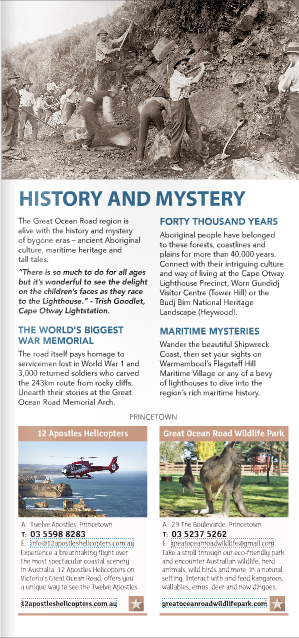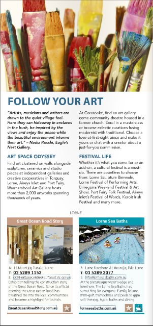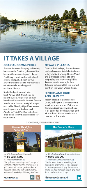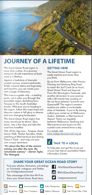 Brief: As a companion to the Great Ocean Road Travel Planner, the map delivers inspirational editorial about the region through key themes of welcome, food + wine, natural attractions, great outdoors, arts, history and more. Limited word count. Required review and re-shaping of travel planner text, development of copy + headings + sub-headings.