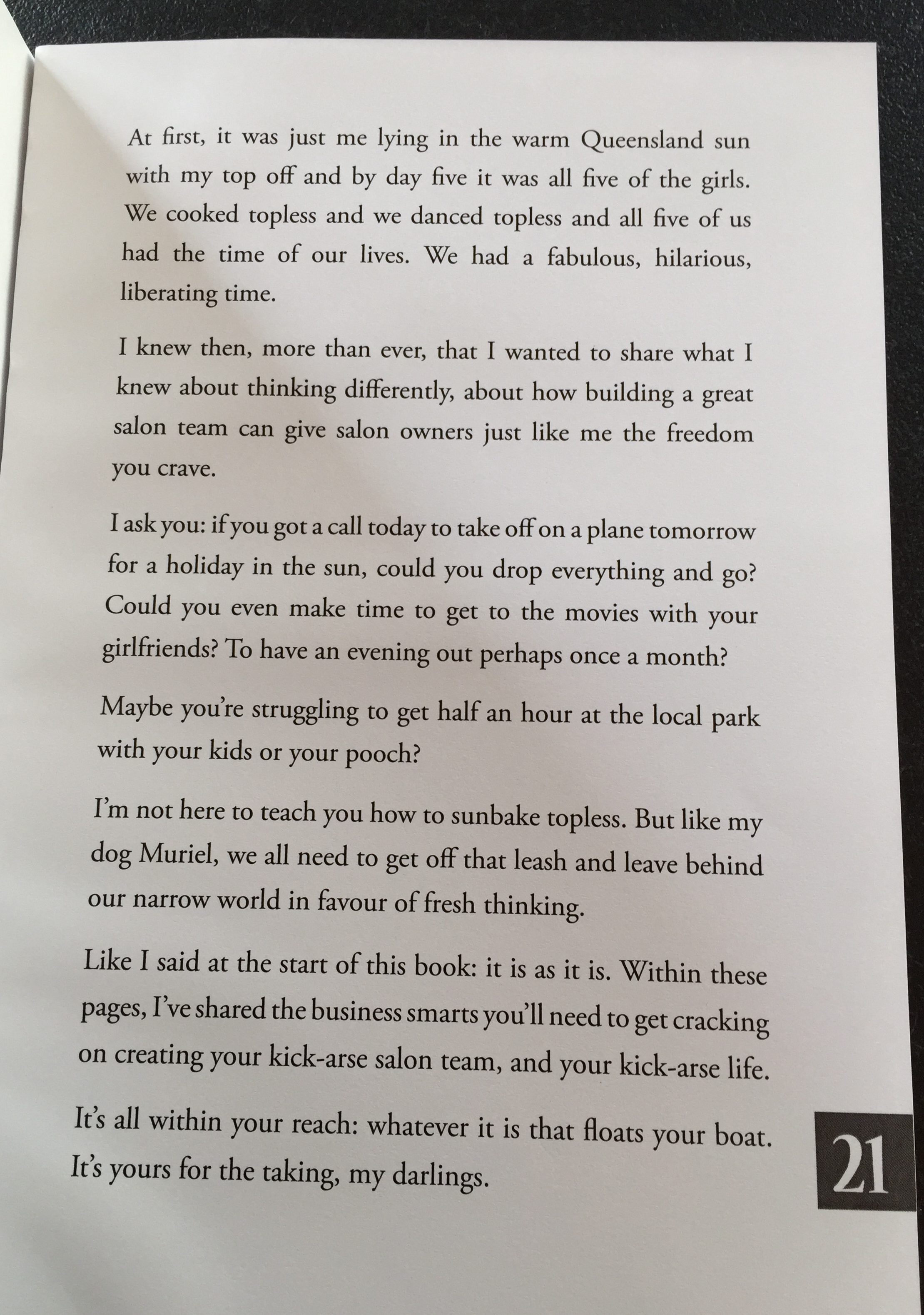 Brief: Copy edit 43,000-word non-fiction book manuscript authored by expert business coach and aimed at salon owners in the hair + beauty sector. Printed book is to sit alongside Lisa’s first title and to share some DNA in terms of structure, look + feel. Also to be available as an ebook. Consulted with Lisa on chapter structure, tone, format, pull quotes, chapter headings, hero content. Edited draft content to emphasise storytelling as a connective device to instructional material. Retaining Lisa’s unique, high-energy voice was paramount. Edited for style, consistency, structure, meaning, grammar and spelling. Developed content for cover blurb, forward and other book marketing materials, always working closely with Lisa to achieve her aims for her book.